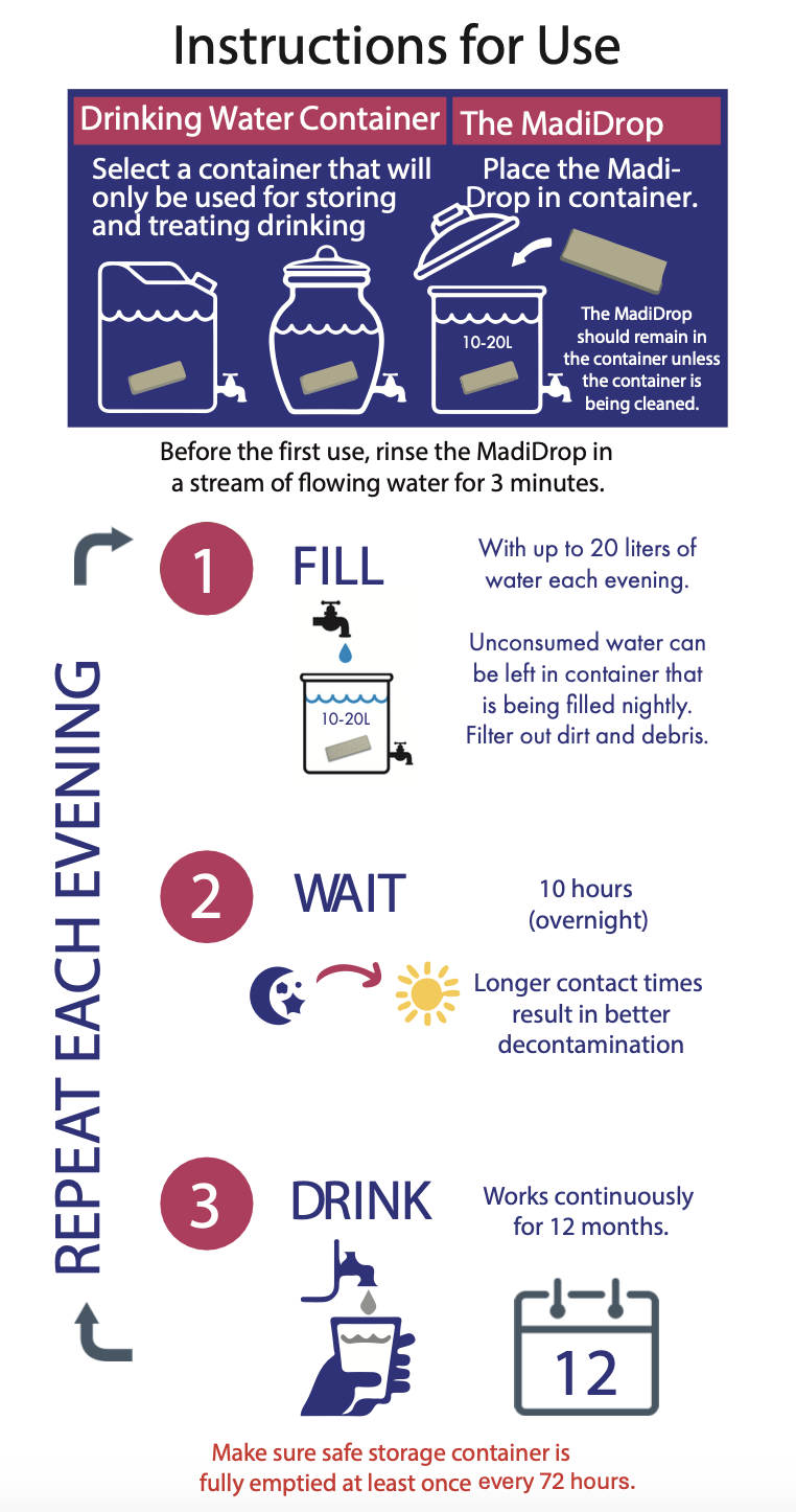 Designate a covered drinking water container with a spigot to limit contamination from hands and other external sources. Use the MadiDrop® in a 10-20 liter water storage container and leave it there. Water added daily is continuously treated.