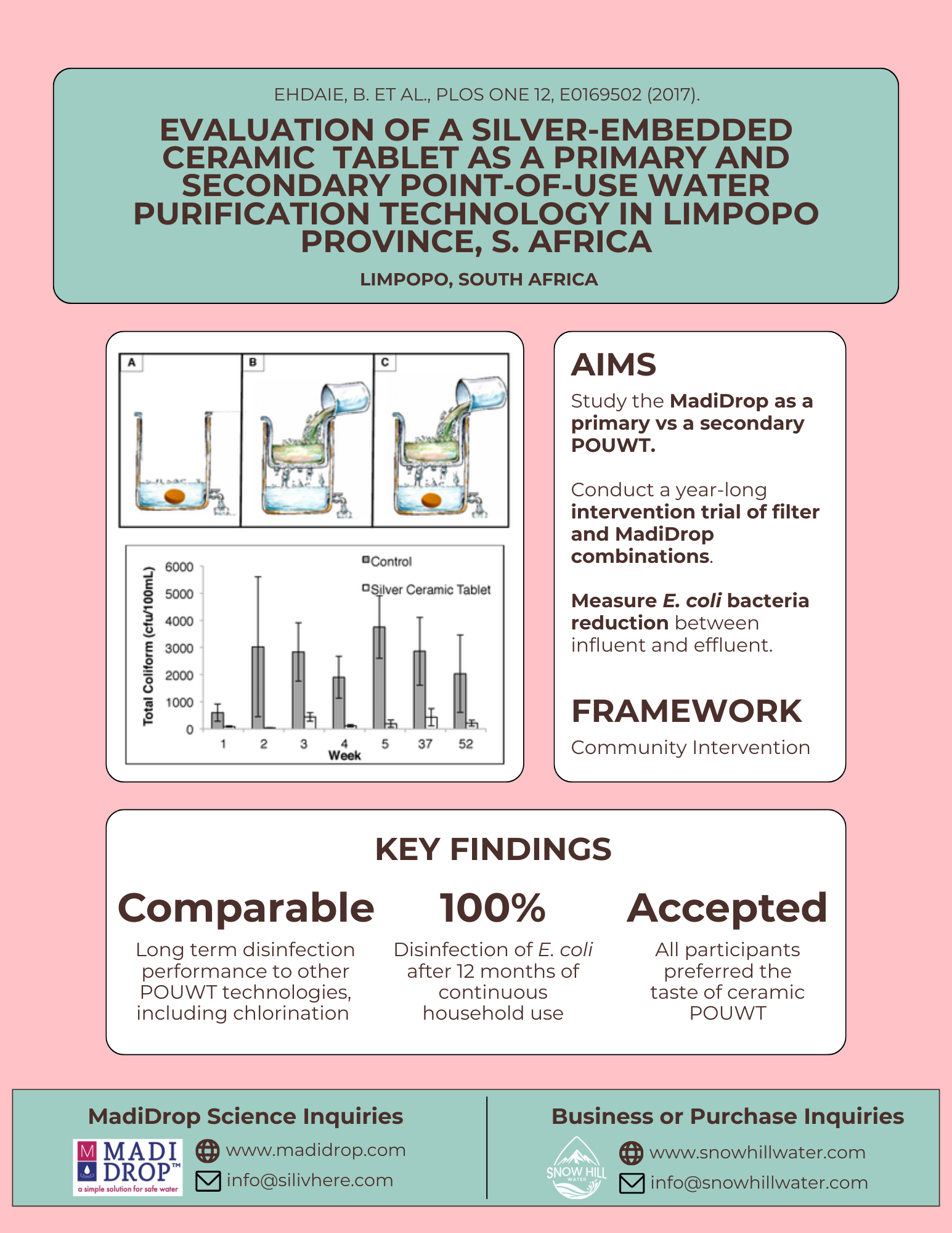 Ehdaie, B., Rento, C. T., Son, V., Turner, S. S., Samie, A., Dillingham, R. A., & Smith, J. A. (2017). Evaluation of a Silver-Embedded Ceramic Tablet as a Primary and Secondary Point-of-Use Water Purification Technology in Limpopo Province, S. Africa. PLOS ONE, 12(1), e0169502. https://doi.org/10.1371/journal.pone.0169502